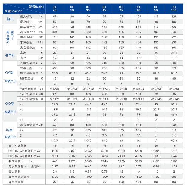 DX系列气动离合器制动器工作气压不低于5.5KG/平方厘米,不超过6.KG/平方厘米此类型气动离合器以其优良的品质,卓越的性能为设备动力提供有力的保障,安装简单,经久耐用,质量可靠。DX气动离合器主要用于冷镦机、高速冲压机械、锻压冲压设备、高精冲床设备、纺织机械、纸工机械、模切机械、裁断装置等设备。